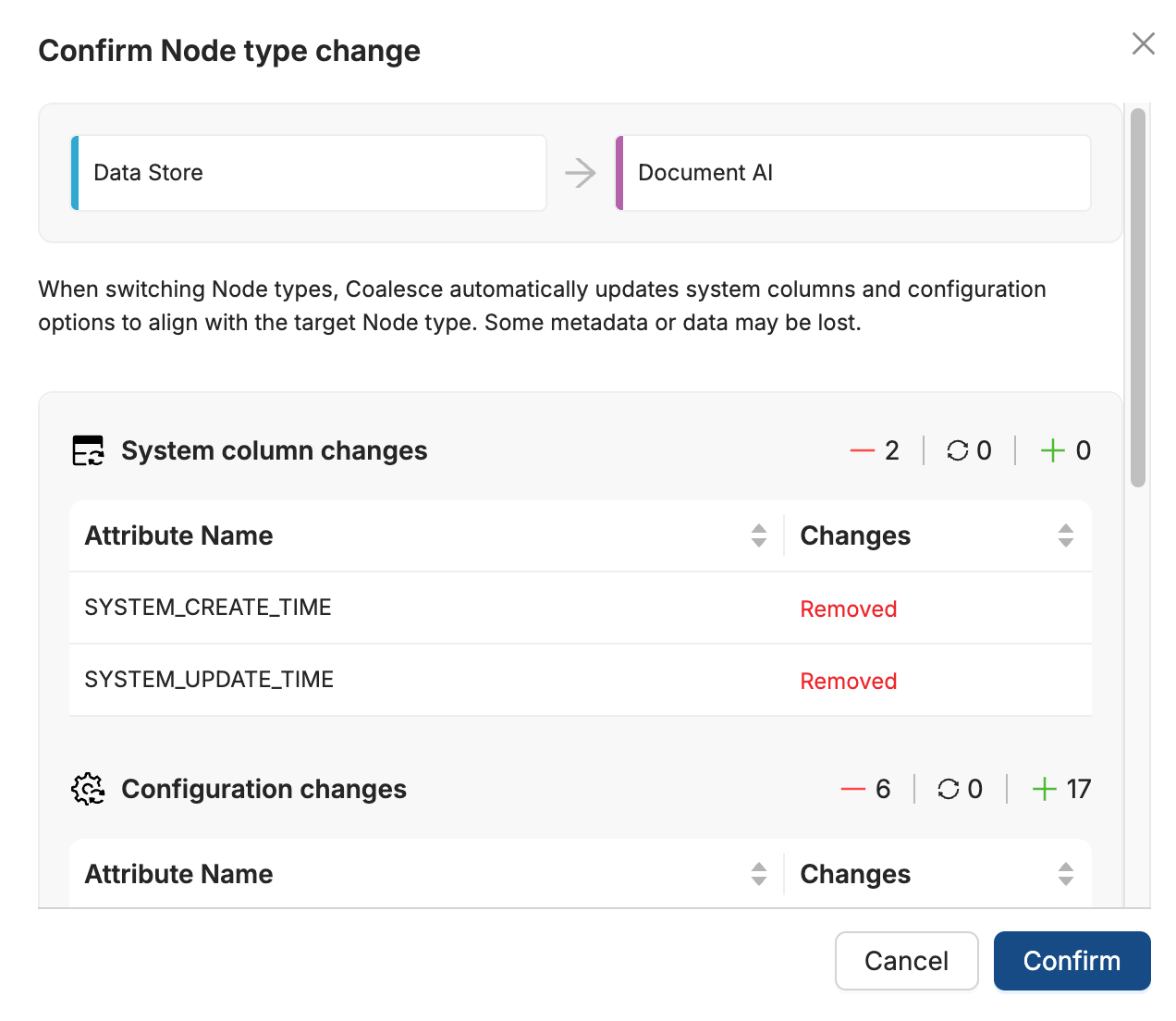 We've made significant improvements to Node type switching in Coalesce. When changing a Node's type (for example, from View to Dimension), Coalesce now performs a complete metadata reinitialization based on the target type definition. This ensures your Node fully adopts the target type's structure while intelligently preserving your work.